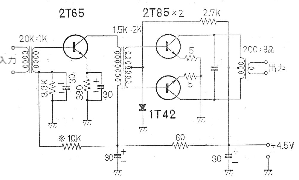 Esta etapa de 3 transistores es típica de radios y amplificadores de los años 60. Los transistores son de germanio y el circuito fue encontrado en una documentación japonesa de 1967. Los transformadores son los elementos críticos del circuito. La potencia es de 300 mW.