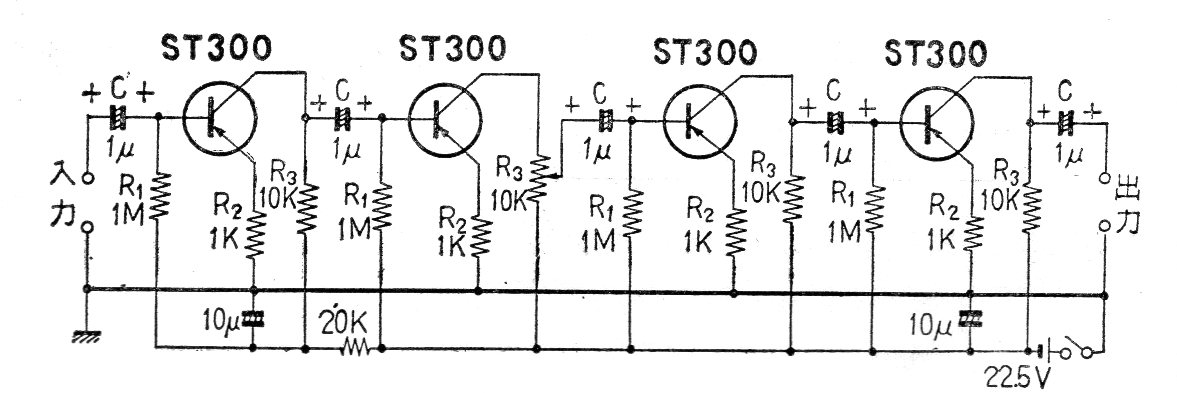 Este circuito de alta ganancia se puede utilizar en aparatos de ayuda auditiva. El circuito es de una documentación de 1967 y utiliza transistores de germanio. La alimentación se realiza con una tensión de sólo 2 V.