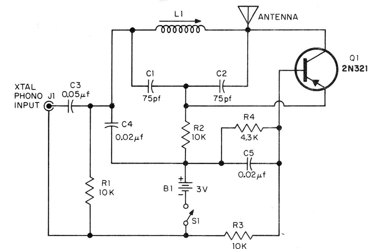 Los sonidos de un tocadiscos con fonocaptor de cristal o cerámico se transmiten a una radio de ondas medias cercanas. El circuito es de 1964 pudiendo ser implementado con un transistor BC558. Los condensadores son cerámicos y L1 está formada por 80 espiras de hilo 28 en un bastón de ferrita. La antena es telescópica o un pedazo de hilo de 50 cm a 4 metros.