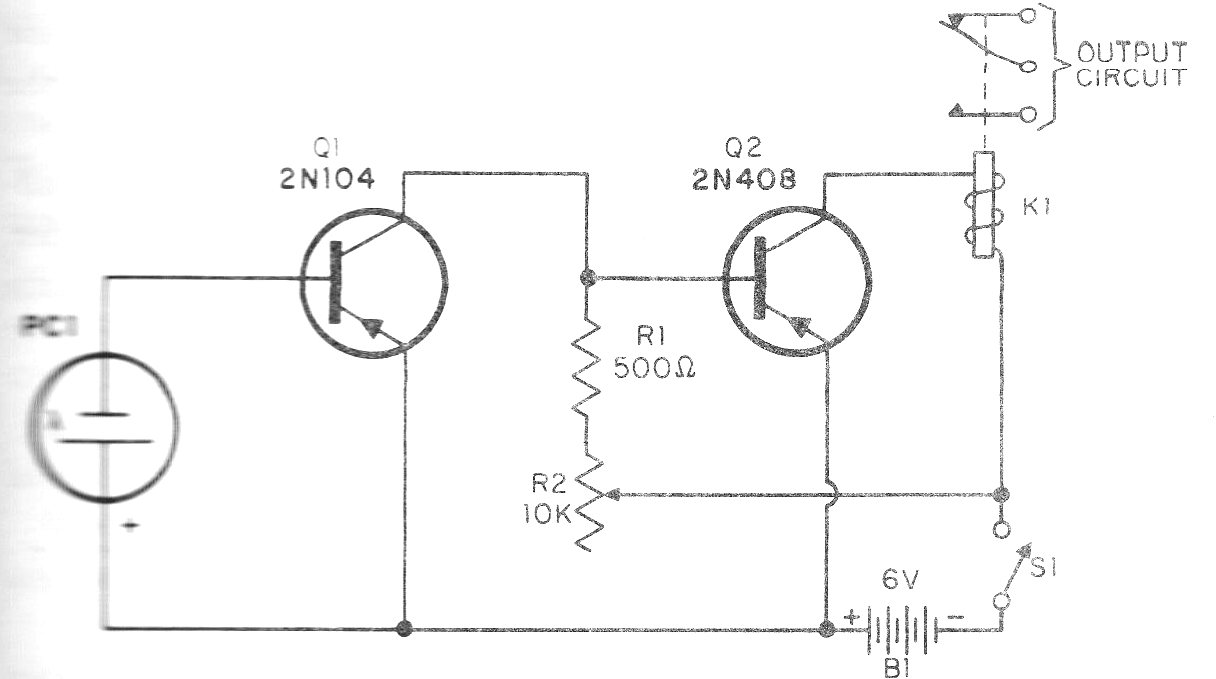 Encontramos este circuito en una publicación de 1964, pero puede montarse actualmente con transistores BC558. El sensor puede ser una foto-célula del tipo que se encuentra en las calculadoras y los juguetes. El relé es del tipo sensible para 6 V. El circuito también funciona con 12 V utilizando un relé para esta tensión.