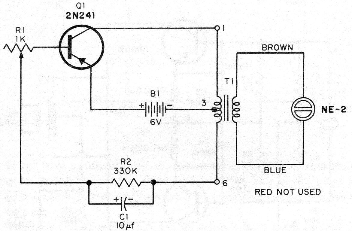 En este circuito una lámpara de neón pulsa en intervalos determinados por el ajuste de R1. Este componente se puede aumentar así como C1. El transformador tiene un primario de 110 V o 220 V y secundario de 3 a 9 V con corriente de 50 mA a 250 mA.