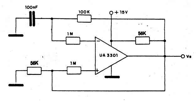 La frecuencia de este astable está dada por el capacitor de 100 nF cuyo valor puede ser modificado según las necesidades del proyecto, según las características limites del integrado. El integrado usado puede ser un µA3301 ó un µA3401 de Fairchild. La fuente es de 15V.