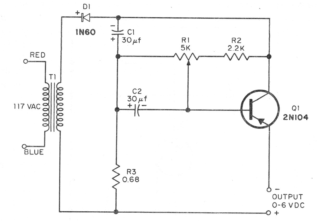 La fuente ajustable mostrada en la figura fue encontrada en una publicación americana de 1964. El transistor puede ser el BD136 para corrientes hasta 500 mA. El diodo D1 es preferentemente el 1N4002 y el transformador tiene secundario de 6 V con corriente entre 50 y 500 mA.