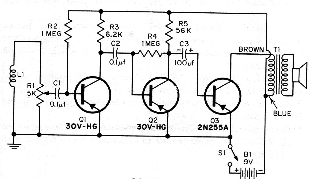 Encontramos este circuito en una documentación de 1964. Los transistores pueden ser sustituidos por equivalentes más modernos y el transformador es del tipo de salida encontrado en radios transistorizados. El circuito funciona con una bobina captadora junto al aparato, que debe ser del tipo analógico. Esta bobina tiene de 1000 a 5000 espiras de hilo bien fino.