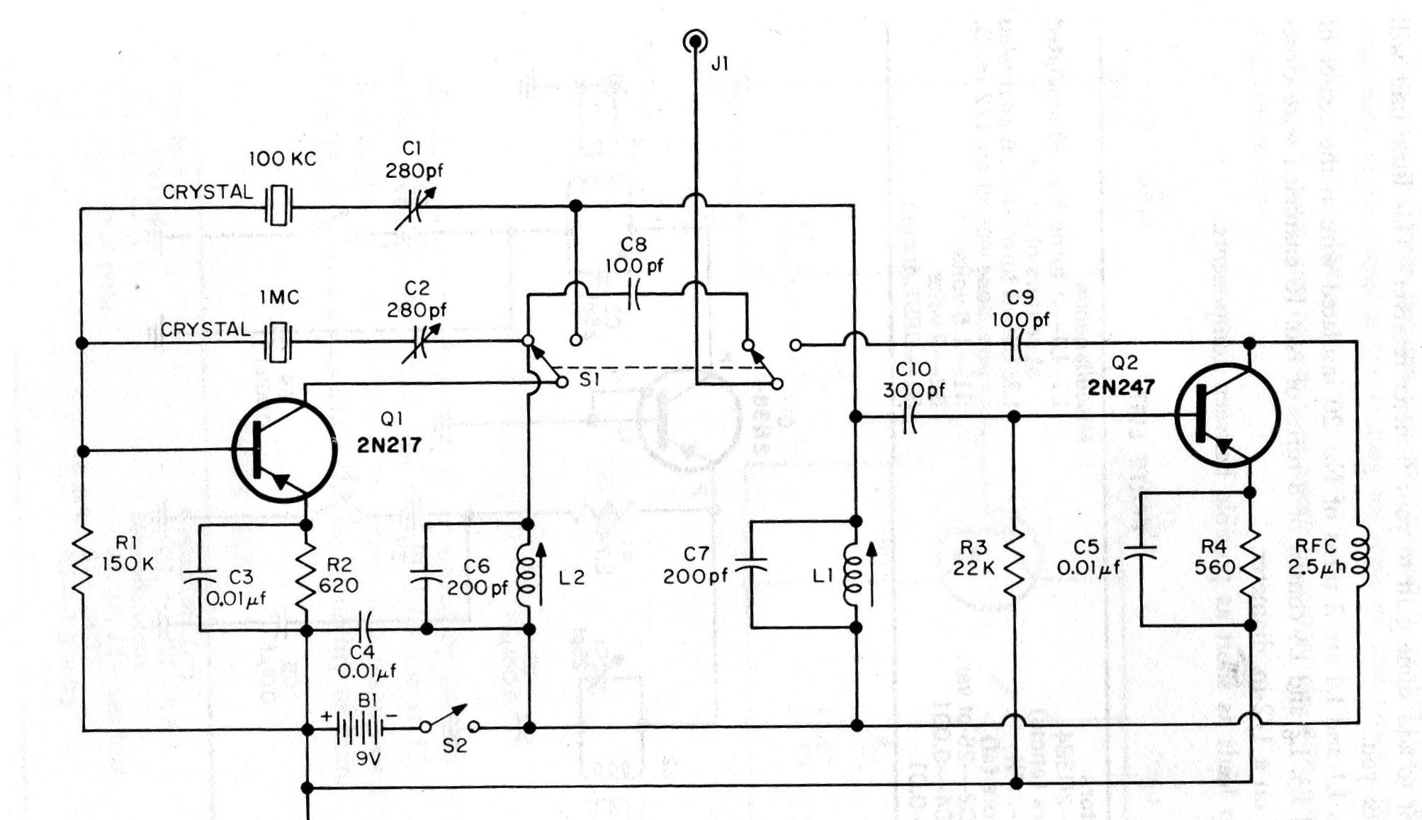 Encontramos este circuito en una documentación americana antigua. Se puede implementar con transistores más modernos como los BC558. El circuito genera señales fijas según la frecuencia de los cristales. L1 y L2 son choques de RF 1 mH aproximadamente.