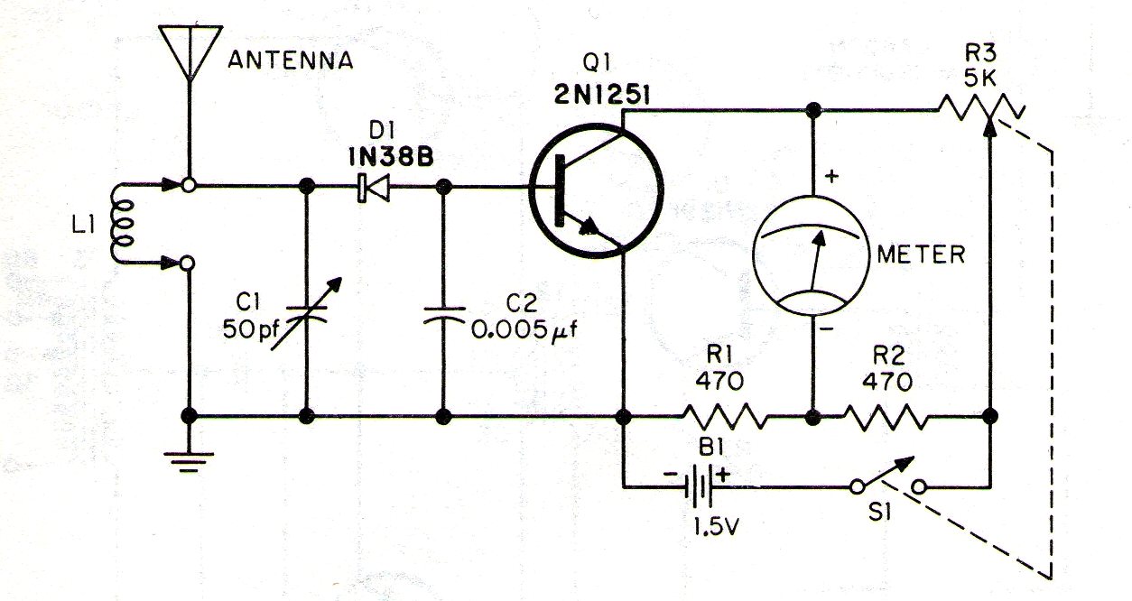 Encontramos este circuito en una documentación americana de 1964, pero él puede ser montado con facilidad aún hoy, pues los componentes no son críticos. El circuito sirve para evaluar la emisión de transmisores de radioaficionados. La bobina L1 depende del rango de frecuencias analizado.