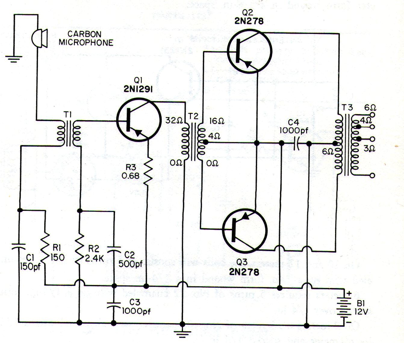 Este amplificador de audio para la modulación de transmisores AM de radioaficionados es de una publicación americana de 1964. Los componentes críticos son los transistores originales y los transformadores. La alimentación viene de la batería de coche de 12 V.
