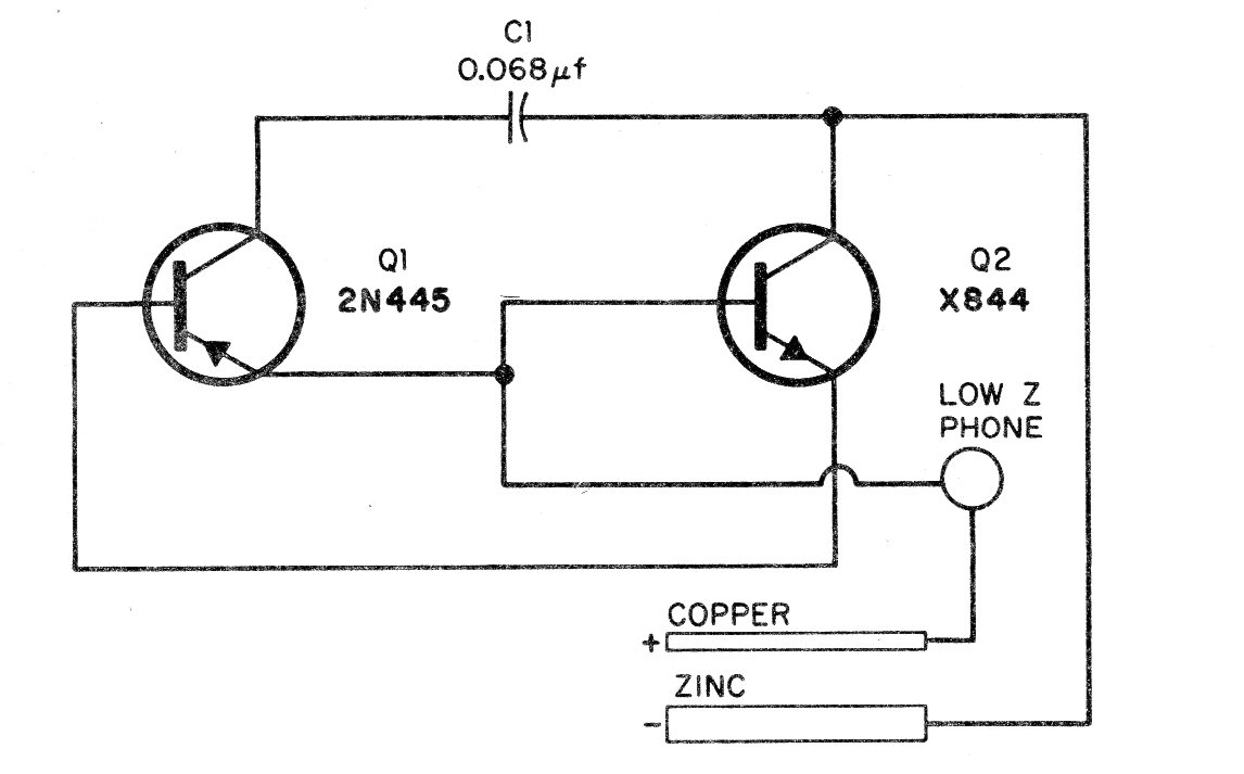 Este oscilador funciona con tensiones a parir de 1 V de fuentes alternativas de energía, como una batería de agua y sal (clorox). El circuito es de una documentación de 1964 y funcionará mejor con transistores de germanio, pero pueden ser probados los BC548 y BC558 que ya exigen una tensión de por lo menos 1,2 V.