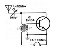 En el receptor presentado, de una documentación de 1964, un transistor se utiliza como detector, funcionando sin alimentación. La antena debe ser muy larga y L1 formada por 100 espiras de hilo 28 en un bastón de ferrita. L2 está formada por 30 espiras del mismo hilo sobre L1. El auricular es de alta impedancia. Cualquier transistor puede ser utilizado, pero mejores resultados se obtienen con tipos antiguos de germanio.