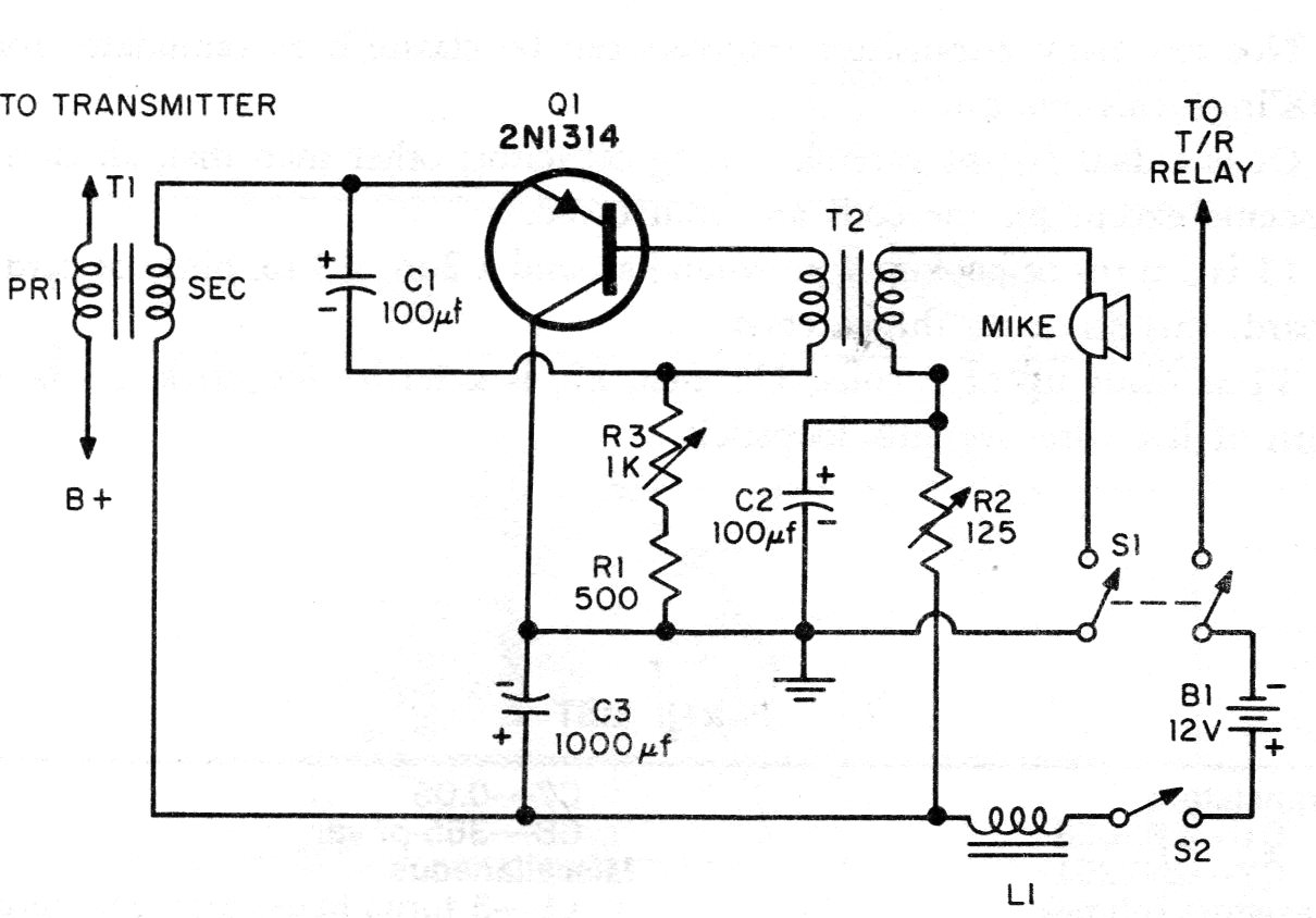 Este circuito se destina a la modulación de pequeños transmisores AM con el mismo orden de potencia. El circuito es de una publicación de 1964. Los transformadores son los elementos críticos y el transistor puede ser el BD136 o TIP32. El micrófono es de baja impedancia.