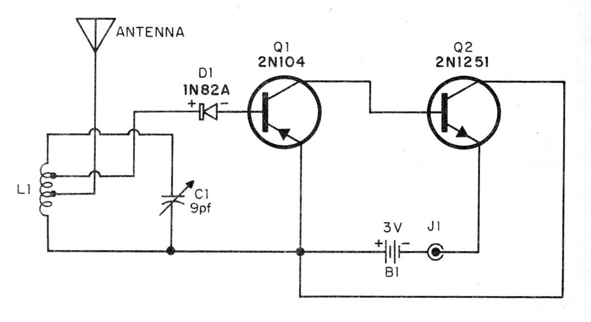 Este simple receptor de detección directa utiliza dos transistores proporcionando su señal a un auricular de alta impedancia. La bobina está formada por 4 espiras de hilo16 o 20 en forma de 1 cm sin núcleo con tomas en la segunda y tercera espira. La antena es telescópica y el diodo puede ser el 1N34.
