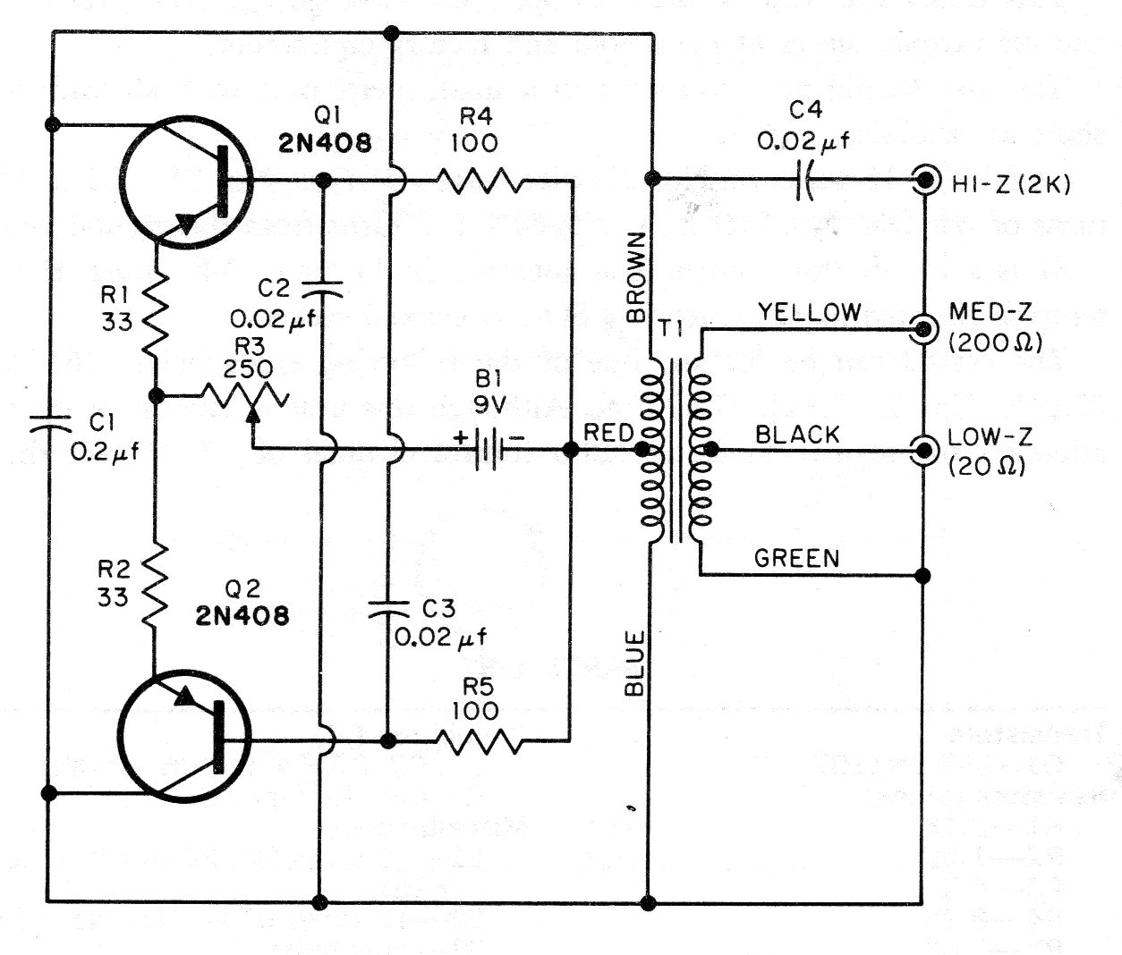 Encontramos este oscilador en contra-fase en una publicación de 1964. Se pueden utilizar transistores BC558 y el transformador puede ser del tipo de alimentación con secundario de 6 + 6 V y corriente hasta 300 mA. La frecuencia depende del capacitor y del ajuste y para los valores indicados está alrededor de 2 kHz.