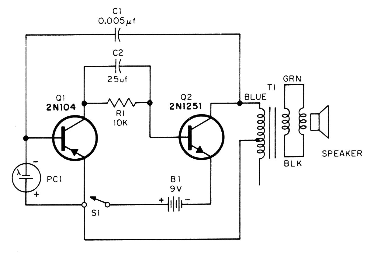 El sonido generado por este instrumento experimental depende de la luz o la sombra sobre el sensor. El sensor es una célula común del tipo que se encuentra en las calculadoras y otros aparatos solares y la frecuencia básica depende de C1. El transformador es del tipo de salida encontrado en radios transistorizados antiguos.