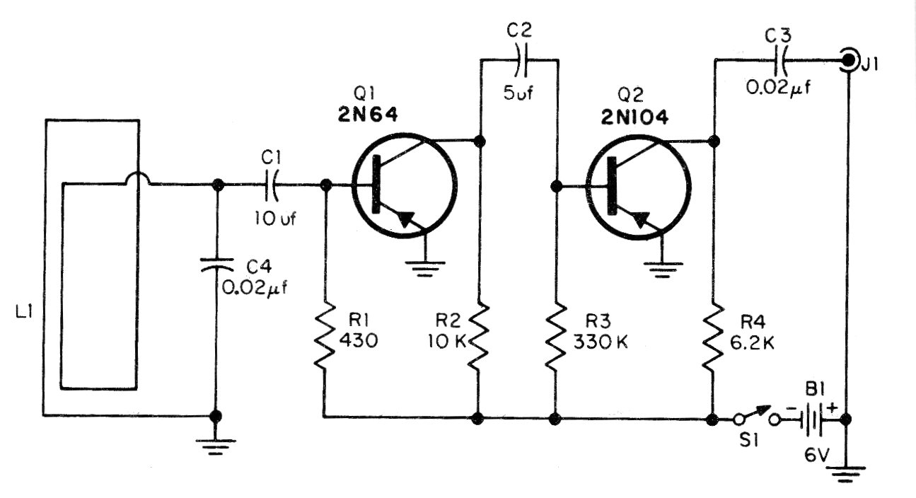 Este receptor experimental, encontrado en un libro de 1964, está destinado a la recepción de señales entre 4 y 16 kHz. La antena de cuadro L1 consiste en 200 vueltas de cable 26 o 28 en un cuadro de al menos 1 m de diámetro. Los transistores pueden ser los BC558 y la salida debe aplicarse a un auricular o un amplificador.
