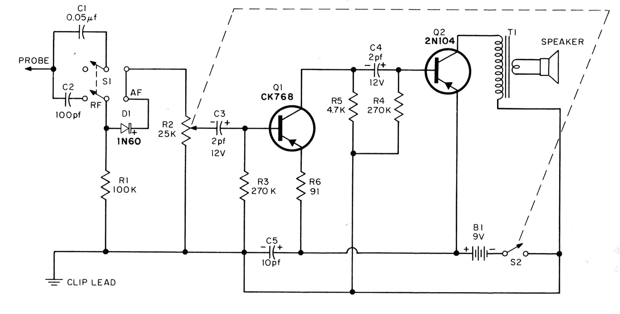 Encontrado en una documentación de 1964, este circuito está indicado para aplicaciones en radio y TV (analógica antigua). Los transistores pueden ser los BC558 y el transformador es del tipo de salida para radios transistorizados. La alimentación se puede realizar mediante pilas.
