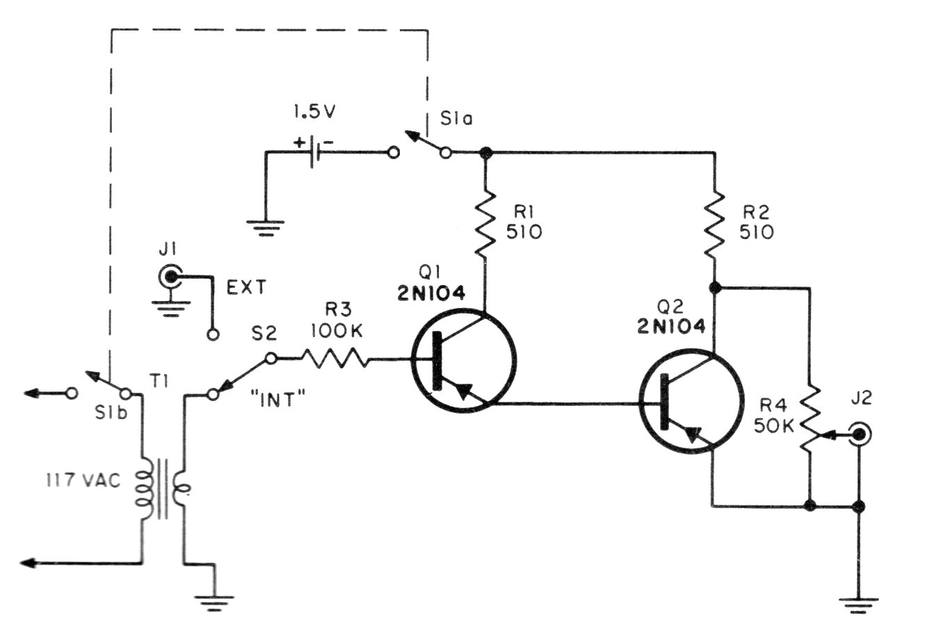 Este circuito, encontrado en una documentación técnica de 1964, genera sinis rectangulares de 60 Hz, tomando como referencia la red de energía. Se pueden utilizar transistores BC558 y el transformador tiene un secundario de 4,5 a 7,5 V con corriente hasta 300 mA. El potenciómetro de salida puede ser de 47k.