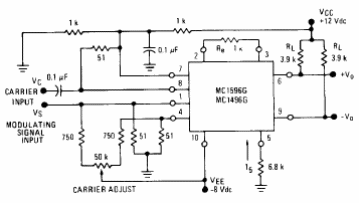 El circuito presentado utiliza un componente que no es muy común actualmente. Encontramos esta configuración de modulador en el Linear Databook de Motorola de 1990.