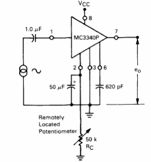 El componente usado, que no es muy común actualmente, es un atenuador electrónico. En esta aplicación del Linear Databook de Motorola de 1990 está conectado como un control remoto de volumen.