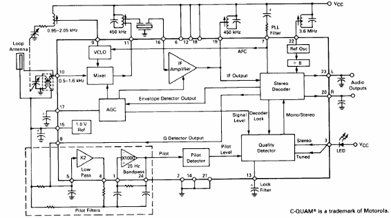 El sistema estéreo AM QAM funciona experimentalmente con algunas estaciones, pero no debe ser dotado, pues la radio digital debe ocupar su lugar. El circuito presentado es del Linear Databook de Motorola de 1990.