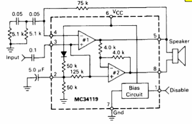 El circuito integrado utilizado es poco común actualmente. El circuito es sugerido por el Linear Databook de Motorola de 1990. El altavoz o el auricular es de 32 ohms o más.