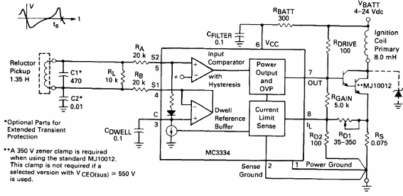 Este circuito de encendido electrónico fue encontrado en el Linear Databook de Motorola de 1990. Los componentes no son muy comunes actualmente y el transistor de potencia debe estar dotado de disipador. El circuito es de un sistema de encendido asistido con sensor magnético.