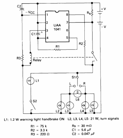 Esta flecha para automóvil fue encontrada en el Linear Databook de la Motorola de 1990. El circuito es para lámparas, y los valores de los componentes se dan abajo.
