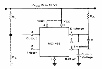 El circuito integrado utilizado es una versión cercana al 555 fabricada por Motorola. El circuito mostrado en la figura es del Linear Databook de Motorola de 1990. Ra y C determinan la temporización.