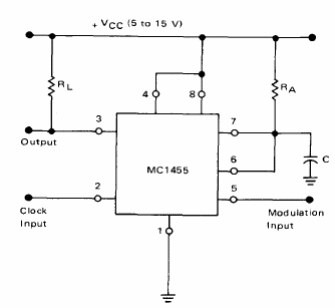 El circuito integrado utilizado en esta aplicación es similar al 555. Los componentes dependen de la frecuencia de los pulsos y de la carga. El circuito fue encontrado en el Linear Databook de Motorola de 1990.