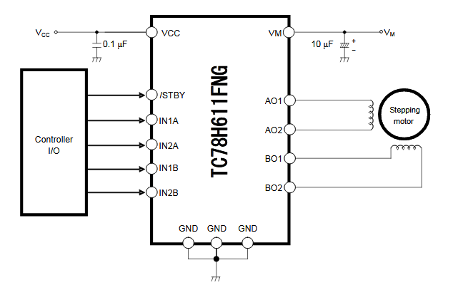 El circuito de shield presentado es del propio datasheet del componente, posibilitando el control de motores de paso de hasta 1,1 A. El circuito integrado es de Toshiba y para su alimentación la tensión Vcc y de 5 V. Para el motor la tensión máxima es de: 18 V. El circuito es de Toshiba.