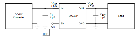 El circuito integrado TLV743P de Texas Instruments consiste en un regulador de tensión con baja caída de tensión (LDO) y una corriente máxima de 300 mA. En la figura tenemos el diagrama del propio datasheet del componente para un regulador usado con microcontroladores.