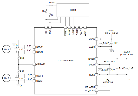 En la figura tenemos un circuito de aplicación para el convertidor de sonido analógico estéreo a digital utilizando el TLV320ADC3100 de Texas Instruments. El circuito se obtuvo del propio datasheet del componente. La alimentación se realiza por dos tensiones que se indican en el diagrama y el consumo es muy bajo.