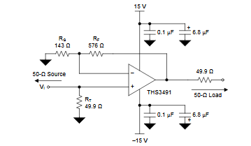 Este amplificador de 320 a 900 MHz con el circuito integrado TSH3491 de Texas Instruments se obtuvo en el propio datasheet del componente. El circuito alimenta directamente una carga de 50 ohmios con corriente de 500 mA llegando a una ganancia de 5 V / V. El circuito requiere una fuente de alimentación simétrica.