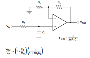 Los amplificadores operacionales LMV3xxA de Texas Instruments son tipos de baja tensión de alimentación (2,5 a 5,5 V). En la figura tenemos un filtro paso-bajo usando este componente y junto al diagrama las fórmulas para el cálculo de los componentes. La fuente debe ser simétrica.