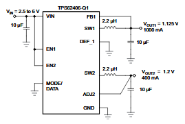 Este circuito se obtuvo del datasheet del componente Texas Instruments que puede suministrar corrientes de 1 A (1,125 V y 400 mA (1,2 V). Las entradas pueden oscilar entre 2,5 y 6 V. El circuito es del step-down .