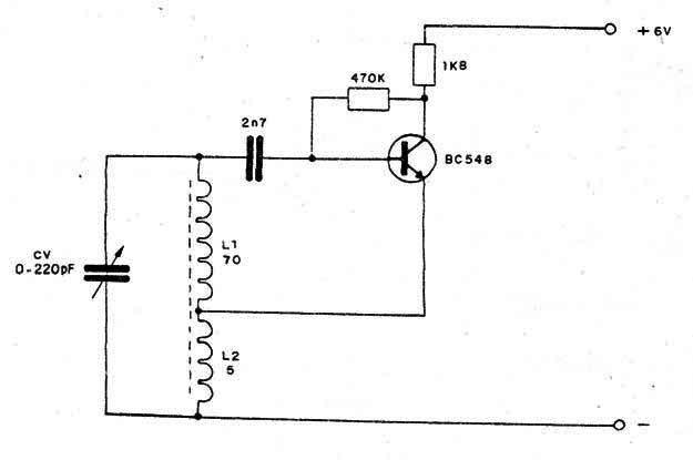El circuito opera en una frecuencia de 1MHz, siendo formada la bobina por 70 espiras de alambre AWG 28 más otra sección de 5 espiras con el mismo alambre enrolladas en un bastón de ferrite de 1 0 cm a 20 cm en 1 cm de diámetro. La tensión de alimentación puede variar entre 6 y 9V. Se da preferencia al uso de transistores de RF para. mayor facilidad de oscilación como el BF494 o el 2A216.