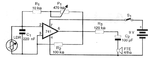 El sensor de esta alarma es un LDR y consiste en un oscilador que entra en acción cuando el sensor deja de recibir luz. El ajuste de la sensibilidad y, por tanto, del punto de disparo y de la propia frecuencia de la señal generada se realiza en P1. El capacitor C1 también influye en la frecuencia de la señal generada, pudiendo ser cambiada en una amplia gama de valores. En la figura tenemos el diagrama completo de esta alarma experimental. Tenga en cuenta que la fuente de alimentación utilizada no tiene que ser simétrica. Como se utiliza un altavoz de baja impedancia, se prevé un resistor limitador de 120 ohms para limitar la corriente en la salida del amplificador operacional. El circuito puede ser fácilmente modificado para utilizar un altavoz o transductor de mayor impedancia o aún excitar un paso amplificador con uno o dos transistores. Con un transistor BD135, por ejemplo, se puede excitar directamente un altavoz de 4 ó 8 ohms. También es interesante observar que otros tipos de sensores resistivos se pueden utilizar en la entrada de este circuito. Con un NTC, por ejemplo, podemos tener una alarma de temperatura. También es posible utilizar un par de hilos como sensores de nivel de agua o de toque en el mismo circuito.