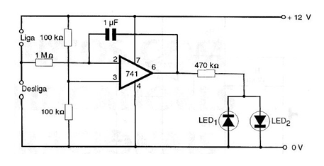 Este circuito se basa en la configuración biestable pero con la diferencia que los valores de los componentes se cambian para permitir el disparo a partir del toque de los dedos en dos sensores. Se utilizan dos LEDs en oposición si el circuito se presenta con fines didácticos. Tocando en uno de los sensores uno de los LED se enciende y el otro se apaga. Con el toque en el otro sensor, el LED que estaba encendido apaga y el que estaba apagado se enciende. En la figura tenemos el diagrama completo de esta llave de toque. Observe que el uso de una red divisora con dos resistores para la tensión de referencia elimina la necesidad de una fuente simétrica. También podemos utilizar en este circuito una etapa de accionamiento para cargas de mayor potencia como, por ejemplo, un relé.