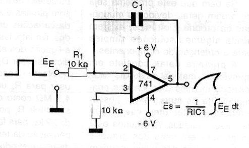 En la figura tenemos la forma simple de obtener un integrador con un amplificador operacional del tipo 741. La relación entre la tensión de salida y la tensión de entrada, en función de los componentes usados es calculada por la fórmula junto al diagrama. Observe que la fuente de alimentación debe ser simétrica y que a partir de una señal rectangular de entrada tenemos una señal exponencial en la salida. Otros amplificadores operacionales se pueden utilizar en la misma configuración.