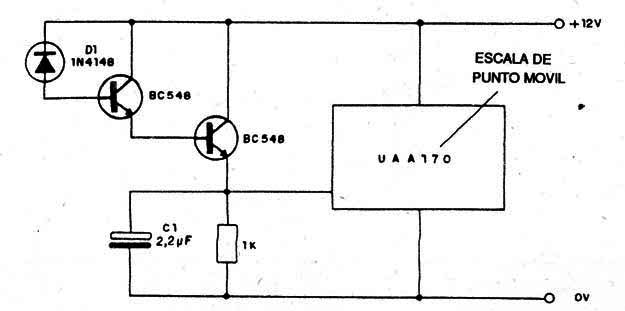Este indicador de temperatura usa un diodo común de silicio como sensor y dos transistores como amplificadores para excitación de un módulo µAA170. Con esto, las variaciones pequeñas de temperatura pueden ser acusadas e indicadas por una escala de punto móvil con i 6 LEDs. Una posible aplicación para este circuito es como termómetro doméstico de gran efecto decorativo. El resistor R1 puede ser alterado en función de la escala.