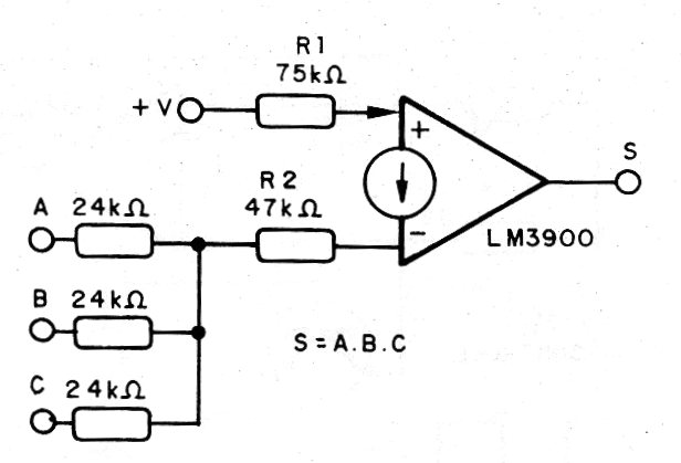 Para obtener una puerta AND (Y), tenemos la configuración mostrada en la figura. Con los valores indicados para los componentes, será necesario que todas las tres entradas estén en el nivel alto, para tener suficiente tensión para conmutar el circuito. Con más de tres entradas el circuito se vuelve crítico.