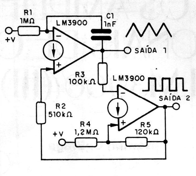 Para obtener señales triangulares tenemos el circuito de la figura que utiliza dos amplificadores. Uno de los amplificadores genera la señal rectangular y el otro lo integra, obteniéndose así la señal triangular deseada.