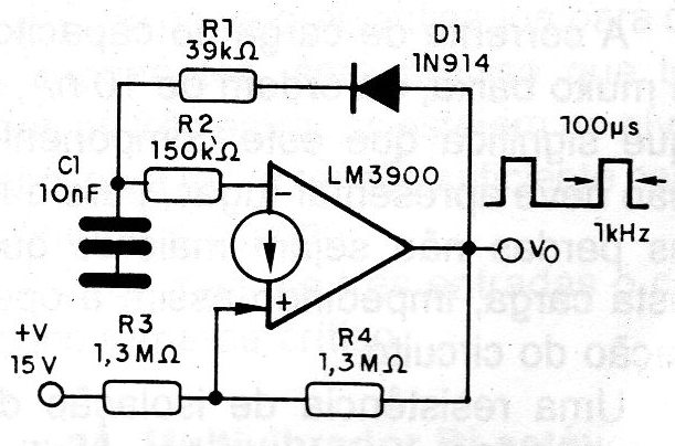 Los pulsos de corta duración se pueden obtener en configuración próxima a la vista anterior (CIR8275), utilizando sólo un amplificador, como muestra la figura. En el circuito indicado no producidos pulsos de 100 us de duración, en una frecuencia de repetición de 1 kHz. Con el uso de diodo, tenemos la carga de C1 vía R1, pero su descarga ocurre vía R2. La relación entre estos componentes determina entonces la relación marca-espacio del generador.