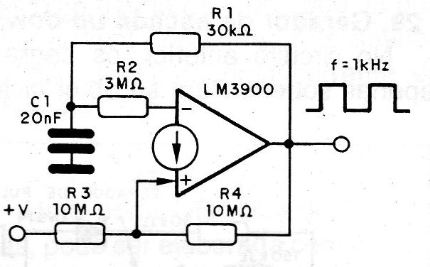 Para obtener señales rectangulares de 1 kHz podemos tener una configuración más simple, con un solo amplificador, como muestra la figura. En este circuito C1 se carga vía R1 y se descarga por este mismo resistor, conforme el operacional conmute en función de la tensión de referencia, establecida por los resistores R2, R3 y R4.