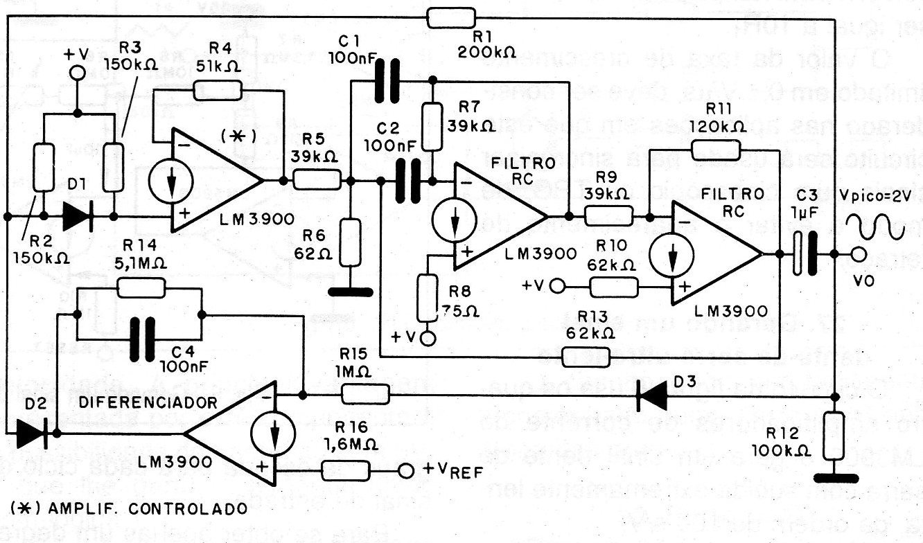 El circuito presentado es un oscilador senoidal a 1 kHz que hace uso de los cuatro amplificadores disponibles en el LM3900, para obtener el mínimo de distorsión. El circuito completo se muestra en la figura. El circuito presentado es en realidad un filtro pasaje de Q elevado, para obtener una salida con pequeña distorsión, y sin el peligro de desplazamientos de esa frecuencia. Un amplificador se añade a la configuración ya conocida como filtro, de modo que la retroalimentación positiva y con ello las oscilaciones. La tensión de pico en la salida será el doble de la tensión de referencia.