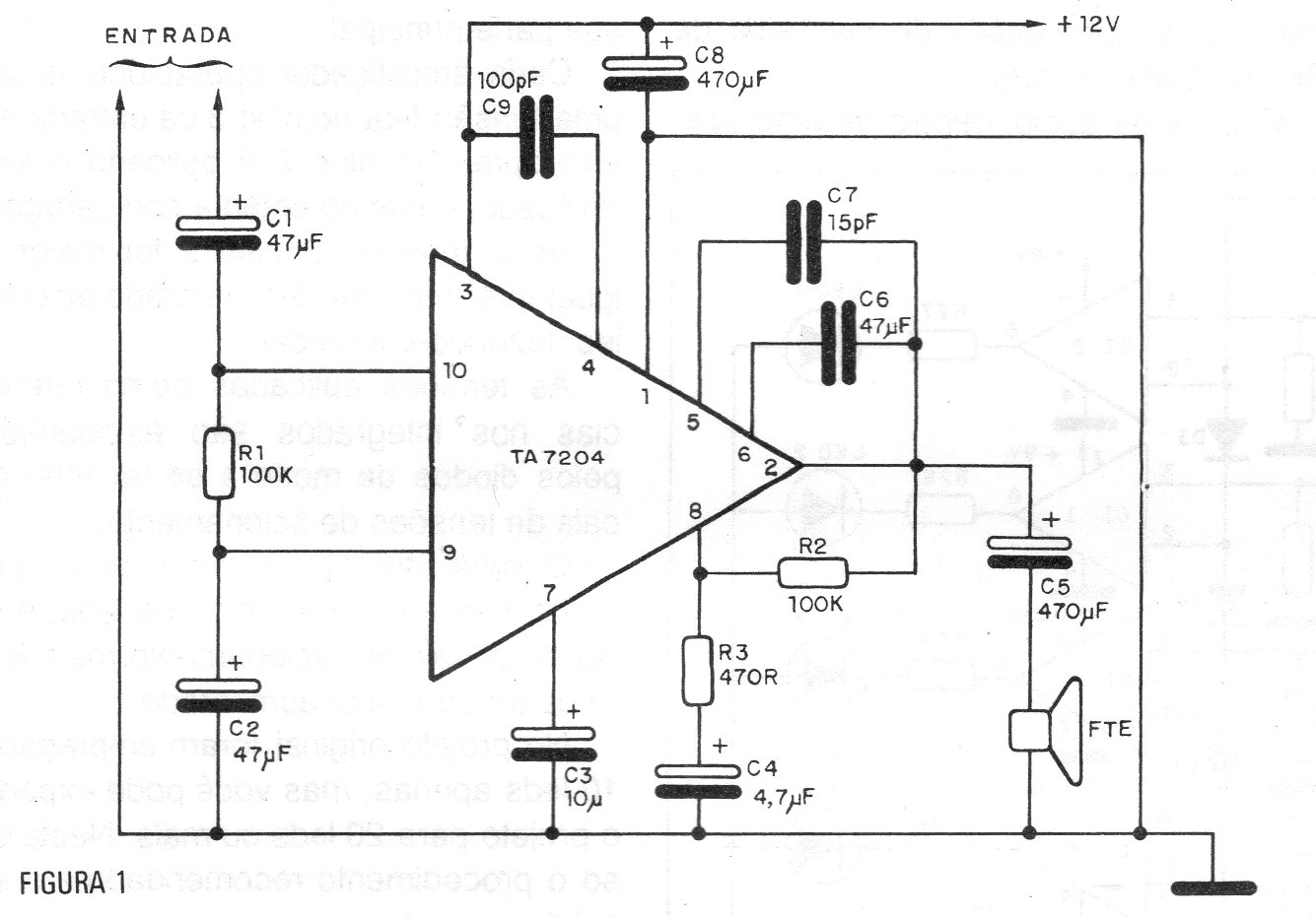El circuito integrado utilizado en este proyecto de 1987 no es muy común en nuestros días. Sin embargo, si se encuentra puede resultar en un buen amplificador con 12 W de potencia cuando se alimenta por 12 V. El circuito integrado debe estar dotado de disipador de calor y la fuente debe tener por lo menos 2 A.