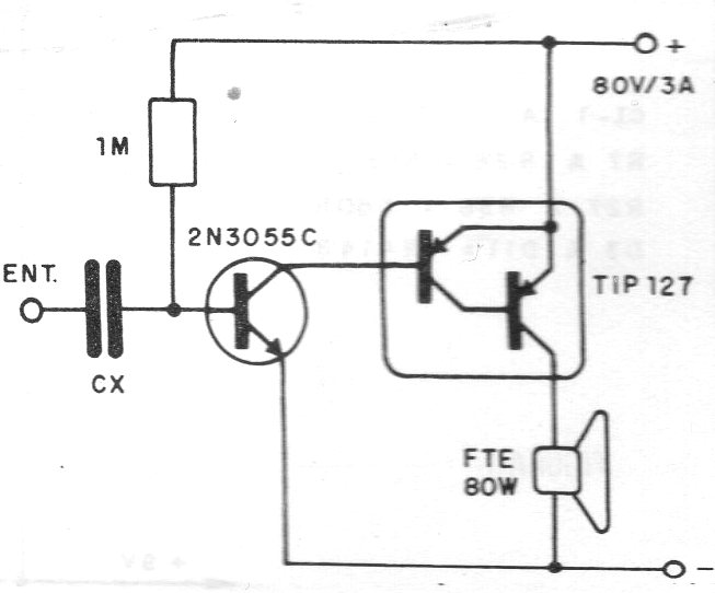 Este paso de audio se puede utilizar en circuitos de sirenas, efectos de sonido y otros para excitar algunos watts de un altavoz. El circuito puede ser alimentado por tensiones elevadas hasta el valor indicado, pero los transistores deben estar dotados de excelentes disipadores de calor.