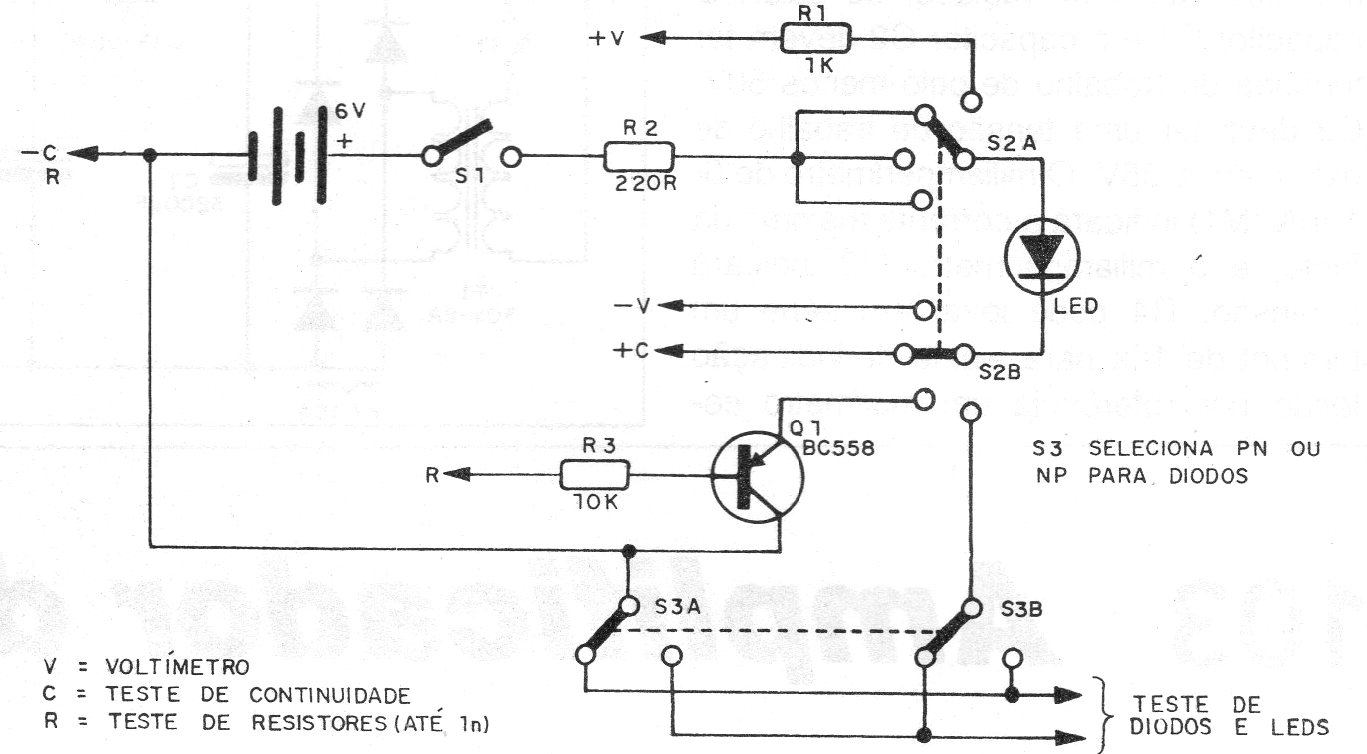 Este simple multiprobador prueba continuidad, semiconductores, fugas y otros problemas de componentes comunes. El circuito utiliza un indicador LED y se alimenta con 4 pilas. Además, también funciona como un voltímetro para bajas tensiones continuas.