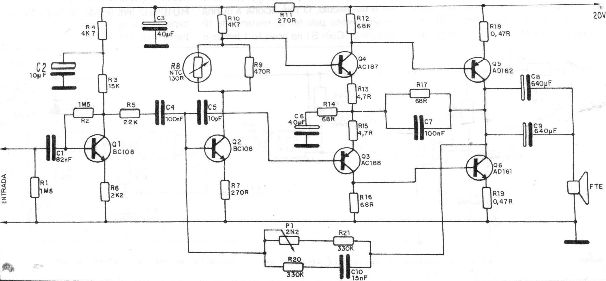 Encontramos este amplificador convencional con transistores complementarios en una documentación de 1987. El circuito debe ser alimentado por fuente de al menos 2 A y los transistores de salida deben estar dotados de buenos disipadores de calor. El NTC hace la estabilización de la corriente de reposo, ajustada en P1. Los transistores de salida y los AC son poco comunes hoy, pero se pueden probar tipos como los BD135, BC136 en su lugar con cambios de algunos resistores de polarización.