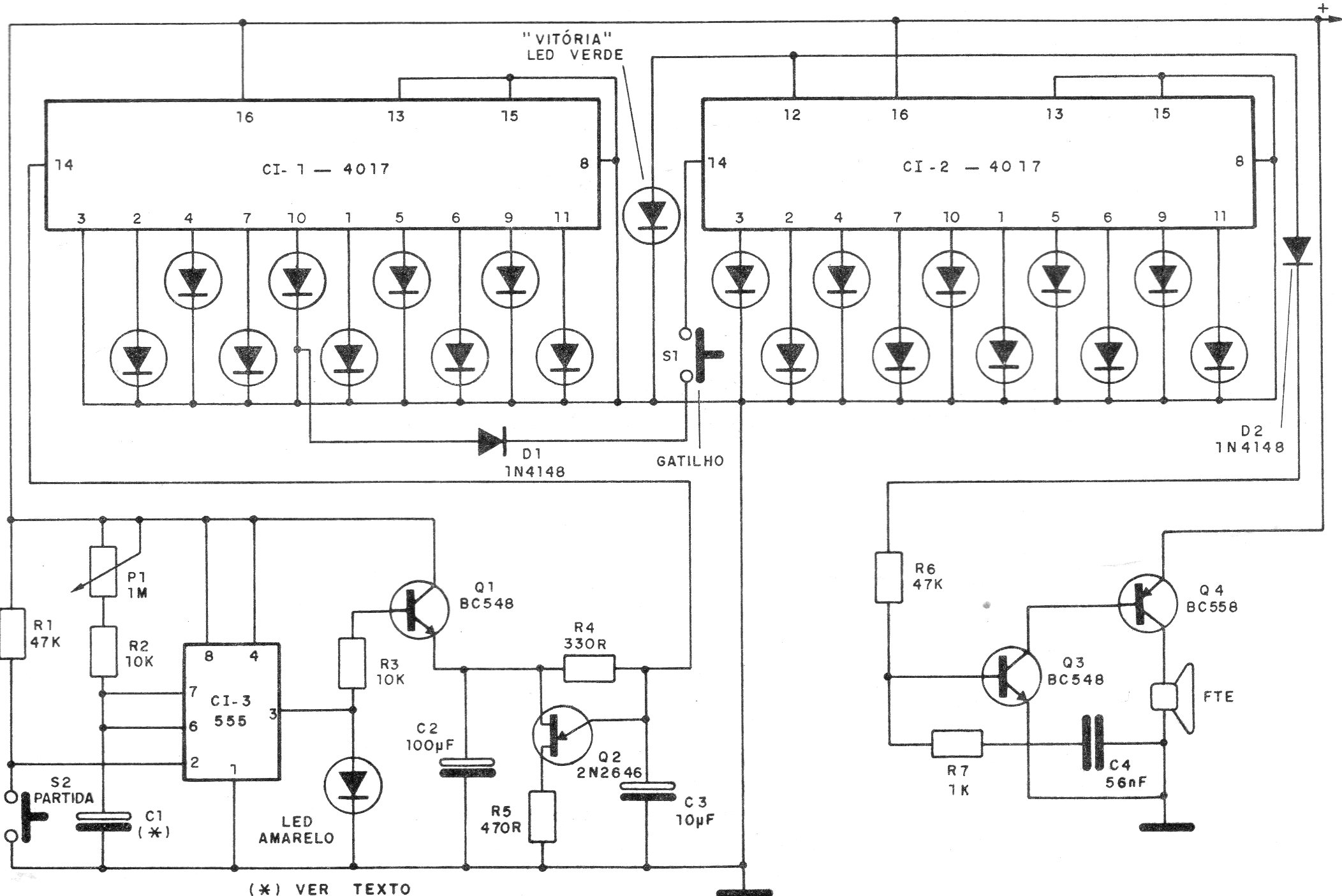 Este juego de tiro al blanco utiliza circuitos CMOS bien conocidos debiendo el jugador golpear el LED pulsando el gatillo cuando pasa por el centro del objetivo (victoria). El circuito es alimentado por pilas (6V) o batería (9V) y tiene un oscilador de efectos sonoros. La velocidad de flujo del objetivo se ajusta en P1.