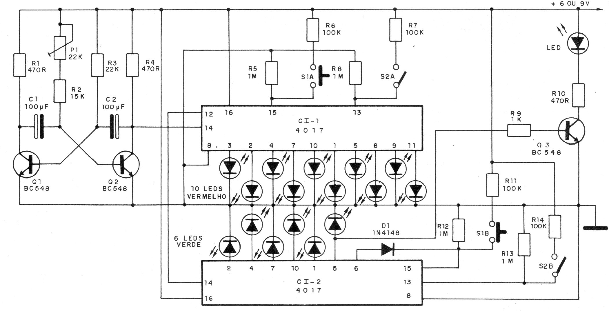Este circuito fue encontrado en una publicación de 1987. Un 4017 hace el recuento secuencial de tiempo en pasos ajustados por el potenciómetro P1. Los pasos de conteo y la temporización dependen de los condensadores C1 y C2 pudiendo llegar a varios minutos. El circuito puede ser alimentado por tensiones de 6 a 9 V.